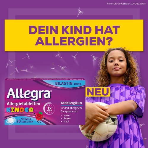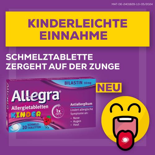 Allegra® Allergietabletten Kinder 10 mg Schmelztabletten. Wirkstoff: Bilastin. Anwendungsgebiet: Antihistaminikum. Zur Linderung der Beschwerden allergischer Rhinokonjunktivitis und Urtikaria bei Kindern im Alter von 6-11 Jahren mit einem Körpergewicht von mind. 20 kg. Apothekenpflichtig. Zu Risiken und Nebenwirkungen lesen Sie die Packungsbeilage und fragen Sie Ihre Ärztin, Ihren Arzt oder in Ihrer Apotheke.