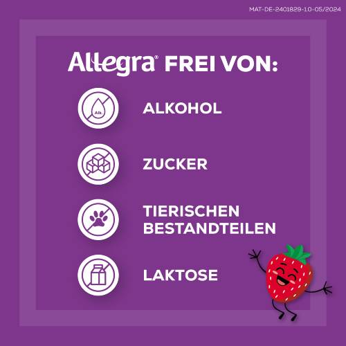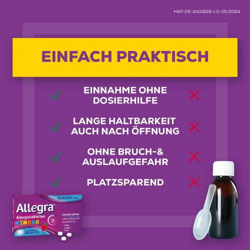 • KINDERLEICHTE EINNAHME: Allegra® Schmelztabletten für Kinder zergehen auf der Zunge und können ohne Wasser eingenommen werden. Sie kontrollieren Allergiesymptome für 24 Stunden bei nur 1x täglicher Einnahme.