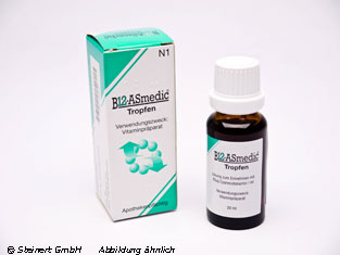 Die B12 Asmedic Tropfen werden zur Behandlung und zur Prophylaxe eines Vitamin B12 Mangels angewendet. Die Tropfen enthalten den Wirkstoff Cyanocobalamin. Dieser Wirkstoff ist maßgeblich an der Reifung der roten Blutkörperchen und am Aufbau der Markscheiden, welche um die Nervenfasern liegen, beteiligt. Bei einem Vitamin B12-Mangel kann es unter anderem zu einer strohgelben Verfärbung der Haut, Blässe, Blutarmut, Durchfall und Ausfallerscheinungen des Nervensystems kommen. Gründe für einen Mangel können Fehl- und Mangelernährungen und Störungen der Vitamin Aufnahme sein. Die B12 Asmedic Tropfen können sowohl die Blutbildung als auch die Funktion des Nervensystems unterstützen.