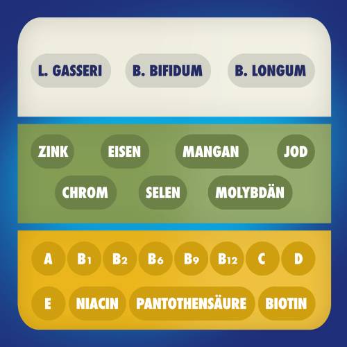 • 3-in-1 Tablette: 3-Schicht-Tablette kombiniert Vitamine & Mineralstoffe mit Bakterien der Darmflora, die Dank einer speziellen Beschichtung den Darm lebend erreichen können.3
