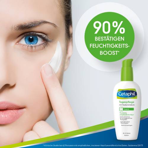 Die spezielle Formulierung der Cetaphil Tagespflege mit einer Kombination aus hochwertigen Feuchtigkeitsspendern wie Hyaluronsäure, Glycerin und Aqualance™ versorgt trockene, empfindliche Gesichtshaut umgehend mit intensiver Feuchtigkeit. Die Creme zieht schnell ein und hinterlässt ein angenehmes Hautgefühl ohne Spannung. Cetaphil Tagespflege mit Hyaluronsäure ist auch als Make-up Grundlage geeignet. Sie verzichtet auf Duftstoffe und ist nicht komedogen. 90% der Verwender würden Cetaphil Tagespflege mit Hyaluronsäure weiterempfehlen1.