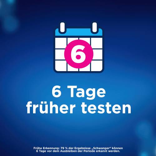 (1) Frühe Erkennung: 79 % der Ergebnisse „Schwanger“ können 6 Tage vor dem Ausbleiben der Periode erkannt werden (dies entspricht 5 Tage vor Fälligkeit der Periode). Wochenbestimmung: 65 % der Ergebnisse „Schwanger“ können 5 Tage vor dem Ausbleiben der Periode erkannt werden (dies entspricht 4 Tage vor Fälligkeit der Periode).