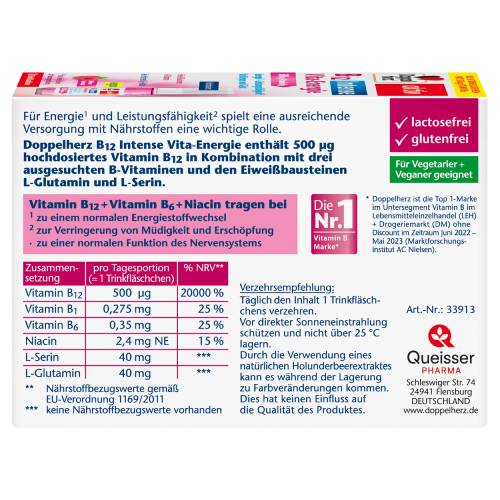 Für Energie und Leistungsfähigkeit spielt eine ausreichende Versorgung mit Nährstoffen eine wichtige Rolle. Doppelherz B12 Intense Vita-Energie enthält 500 μg hochdosiertes Vitamin B12 in Kombination mit drei ausgesuchten B-Vitaminen und den Eiweißbausteinen L-Glutamin und L-Serin. Vitamin B12 + Vitamin B6 + Niacin tragen bei zu einem normalen Energiestoffwechsel, zur Verringerung von Müdigkeit und Erschöpfung sowie zu einer normalen Funktion des Nervensystems bei.