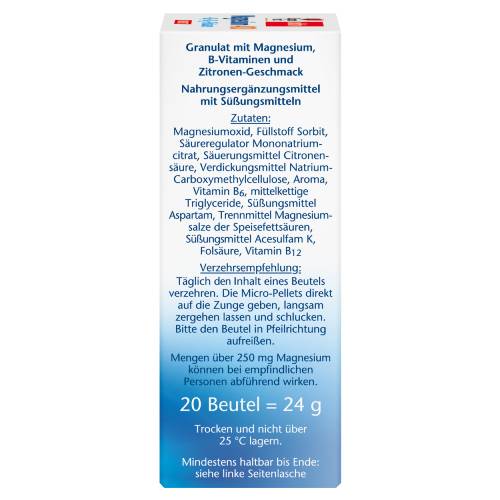 Magnesiumoxid, Füllstoff Sorbit, Säureregulator Mononatriumcitrat, Säuerungsmittel Citronensäure, Verdickungsmittel Natrium-Carboxymethylcellulose, Aroma, Vitamin B6, mittelkettige Triglyceride, Süßungsmittel Aspartam, Trennmittel Magnesiumsalze der Speisefettsäuren, Süßungsmittel Acesulfam K, Folsäure, Vitamin B12