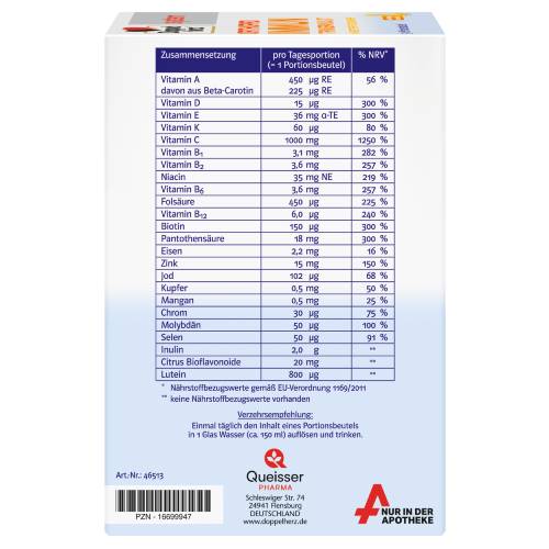 Doppelherz system ORTHOPRO IMMUN TRINKGRANULAT liefert 21 ausgewählte Mikronährstoffe, die einen Beitrag leisten: