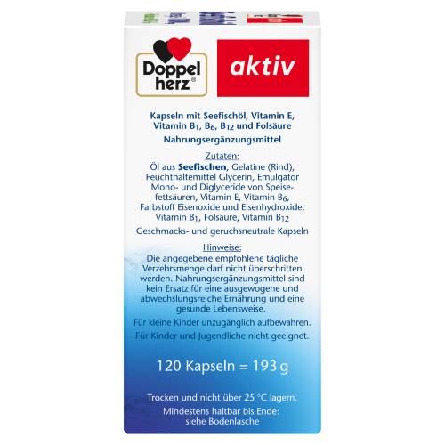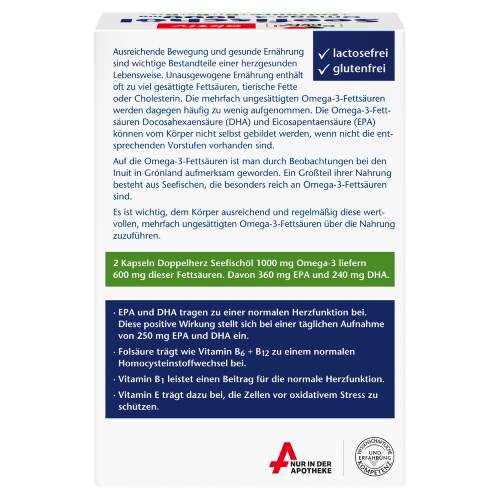 1 Kapsel Doppelherz Seefischöl Omega-3 1000 mg + Folsäure + B1 + B6 + B12 liefert bereits 180 mg EPA und 120 mg DHA. EPA und DHA spielen eine Rolle für die normale Herzfunktion.