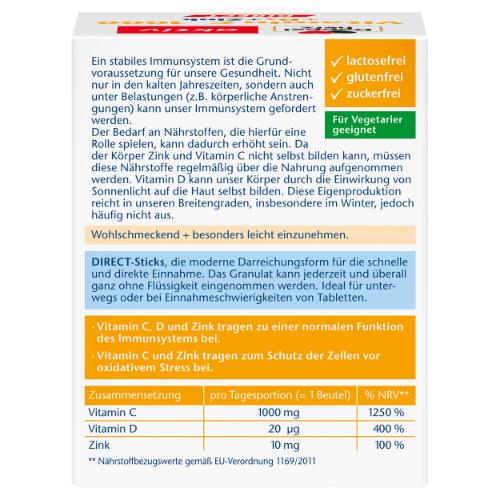 Doppelherz Vitamin C 1000 + D3 + Zink DIRECT kombiniert drei Nährstoffe in einem Produkt. Ein Portionsbeutel enthält 1000 mg Vitamin C (hochdosiert), 20 µg Vitamin D3 (entspricht 800 Internationalen Einheiten; I. E.) und 10 mg Zink. Das Produkt schmeckt angenehm fruchtig nach Blutorange, ist zuckerfrei, für Vegetarier geeignet sowie lactose- und glutenfrei. Ein stabiles Immunsystem ist eine essentielle Voraussetzung für unsere Gesundheit. Nicht nur in den kalten Jahreszeiten, sondern auch in Zeiten starker Belastung (z. B. körperliche Anstrengungen) kann unser Immunsystem gefordert werden. Der Bedarf an Nährstoffen, die hierfür eine Rolle spielen, kann dadurch erhöht sein. Da der Körper Zink und Vitamin C nicht selbst bilden kann, müssen diese Nährstoffe regelmäßig über die Nahrung aufgenommen werden. Vitamin D kann unser Körper durch die Einwirkung von Sonnenlicht auf die Haut selbst bilden. Diese Eigenproduktion reicht in unseren Breitengraden, insbesondere in der dunklen Jahreszeit, oft nicht aus. Vitamin C und Zink tragen zum Schutz der Zellen vor oxidativem Stress bei. Vitamin D trägt zur Erhaltung normaler Knochen sowie zur normalen Muskelfunktion bei.