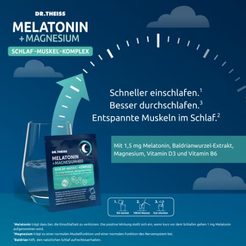 Dr. Theiss Melatonin + Magnesium - die Kombination aus Magnesiumcitrat, 1,5 mg Melatonin, Baldrianwurzel-Extrakt, Vitamin D3 und Vitamin B6