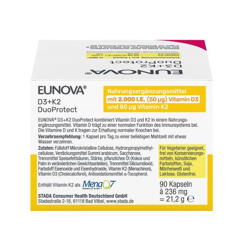 Die Kombination von Vitamin D3 mit Vitamin K in einem Präparat ist im Hinblick auf die Ernährungsphysiologie sinnvoll. EUNOVA DuoProtect D3 + K2 hilft Ihnen, die täglich benötigte Menge an Vitamin D und Vitamin K ganz bequem einzunehmen.