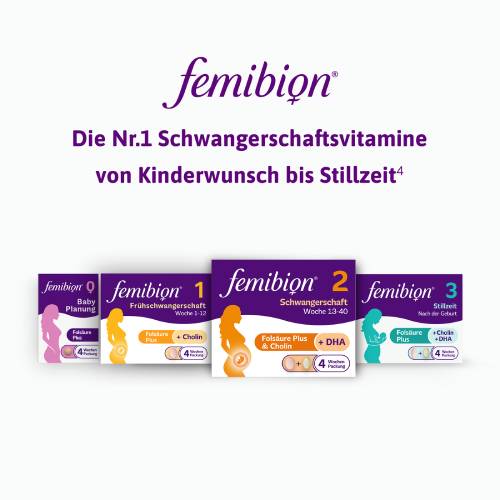 ⁶Femibion® ist die einzige Marke in Deutschland mit Folsäure Plus (eine Kombination aus Folsäure und Metafolin®) und Cholin.