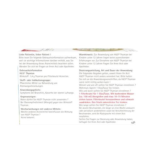 Die Einnahme von H&S® Thymian bei Kindern unter 12 Jahren wird nicht empfohlen. In der Originalpackung aufbewahren, um den Inhalt vor Licht und Feuchtigkeit zu schützen. Nicht über 25°C aufbewahren. Arzneimittel - Für Kinder unzugänglich aufbewahren.
