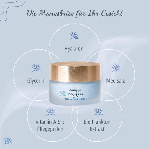 Die Thalasso Gesichtspflege ist inspiriert von der Thalassotherapie, die für ihre wohltuende Wirkung auf Haut und Sinne bekannt ist. Die Thalassotherapie nutzt die natürliche Kraft des Meeres – dazu gehören z.B. Meerwasser, Algen, Meersalz sowie Meeresluft, um die Haut zu regenerieren und mit bewährten Mineralstoffen zu versorgen. Genau dieses maritime Pflegeprinzip steckt in der Thalasso Gesichtspflege: Sie bringt die revitalisierende Frische des Meeres in Ihre tägliche Beauty-Routine und sorgt für einen strahlenden, erholten Teint.