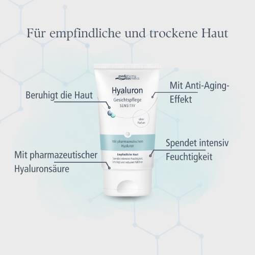 Die Hyaluron Gesichtspflege SENSITIV von medipharma cosmetics wurde entwickelt, um den Bedürfnissen sensibler, trockener Haut gerecht zu werden. Ihre parfumfreie Formulierung wirkt beruhigend auf gereizte Haut. Das Herzstück der Gesichtspflege ist das pharmazeutische Hyaluron. Ein Wirkstoff, der den Körper bei Anti-Aging-Prozessen unterstützt und die Haut intensiv mit Feuchtigkeit versorgt. Die enthaltene Hyaluronsäure wirkt wie ein natürlicher Feuchtigkeitsspeicher und hat somit eine nachhaltig hydratisierende Wirkung. Zusätzlich polstert sie sie auf, was die Minderung von Fältchen und ein ebenes Hautbild unterstützt. Das pharmazeutische Hyaluron kann die Produktion der körpereigenen Hyaluronsäure, welche im Alter abnimmt, außerdem stimulieren.