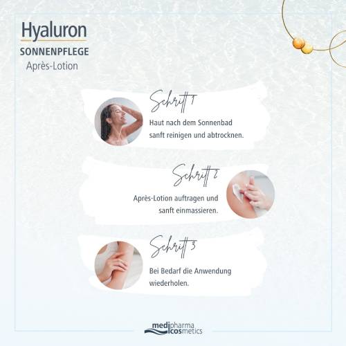 Die Après-Lotion kühlt und erfrischt sonnenverwöhnte Haut. Stellen Sie sich vor, wie Sie an einem warmen Sommertag ins kühle Wasser eintauchen. Unsere Après-Lotion bietet genau dieses erfrischende Erlebnis für Ihre Haut. Dank der bewährten Formel mit pharmazeutischer Hyaluronsäure wird die beanspruchte Haut intensiv mit Feuchtigkeit versorgt. Die leichte Textur zieht schnell ein und hinterlässt keine fettigen Rückstände – für ein angenehmes Gefühl von Frische und Leichtigkeit.