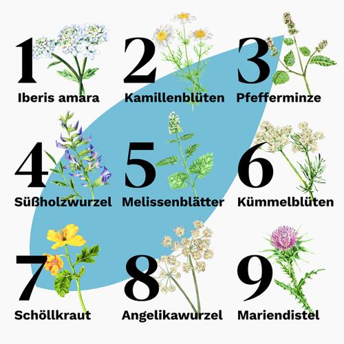 Jede der 9 in Iberogast® Classic verwendeten Heilpflanzen bringt ihre individuellen Fähigkeiten mit, die positiv auf verschiedene Bereiche im Magen-Darm-Trakt einwirken. Doch erst im Zusammenspiel miteinander entfalten die konzentrierten Pflanzenextrakte ihre bewährte Wirkung.  Die in Iberogast® Classic enthaltenen Heilpflanzen sind: