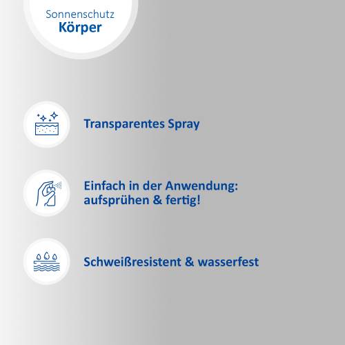 Tragen Sie das Sonnenschutz-Spray vor dem Sport großzügig auf Ihren ganzen Körper auf. Achten Sie besonders auf Nase, Lippen, Ohren, Schultern, Dekolleté, Fußrücken und unbehaarte Kopfhaut. Um den Schutz aufrechtzuerhalten, alle zwei Stunden sowie nach dem Baden und Schwitzen nachsprühen. Zu wenig Sonnenschutzmittel verringert den Lichtschutzfaktor.