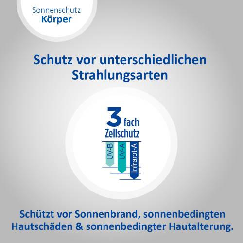 Sonnenstrahlen gibt es in verschiedenen Wellenlängen. Sie haben verschiedene Auswirkungen auf die Haut, wirken jedoch alle zellschädigend. Daher ist es wichtig einen Sonnenschutz zu verwenden, der rundum schützt. Dank seines 3-fach Zellschutzes schützt das Ladival® Aktiv Sonnenschutz-Spray vor UV-A- & UV-B Strahlen, sowie vor den Folgen von Infrarot-A Strahlung.