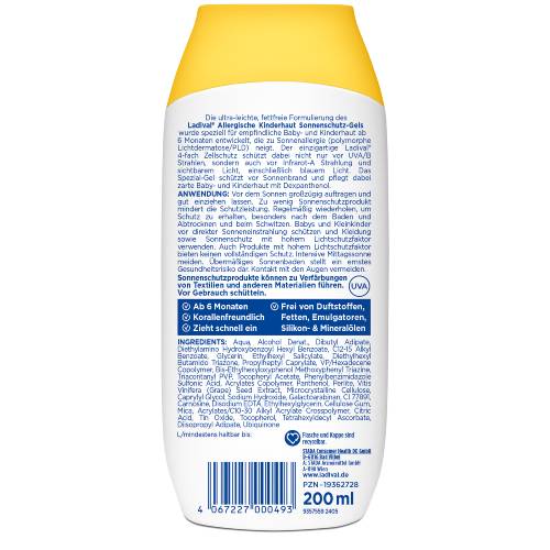 Warum spezielle Sonnencreme für allergische Baby- und Kinderhaut? Baby- und Kinderhaut ist besonders empfindlich gegenüber UV-Strahlen und deutlich anfälliger für Hautreizungen und Allergien. Deshalb ist es wichtig, auf ein Produkt mit einer sanften und dennoch wirksamen Formulierung zu setzen. Was macht den 4-fach Zellschutz so besonders? Sonnenstrahlen gibt es in verschiedenen Wellenlängen. Sie haben verschiedene Auswirkungen auf die Haut, wirken jedoch alle zellschädigend. Daher ist es wichtig einen Sonnenschutz zu verwenden, der rundum schützt. Dank einzigartigem 4-fach Zellschutz schützt das Ladival® Allergische Haut Sonnenschutz-Gel vor UV-A, UV-B, Infrarot-A Strahlen und sichtbarem Licht (einschließlich blauem Licht).