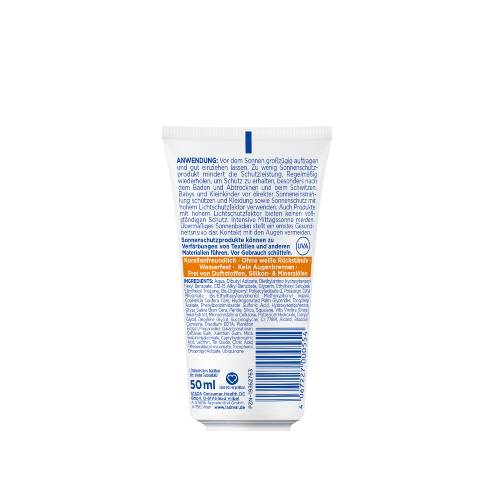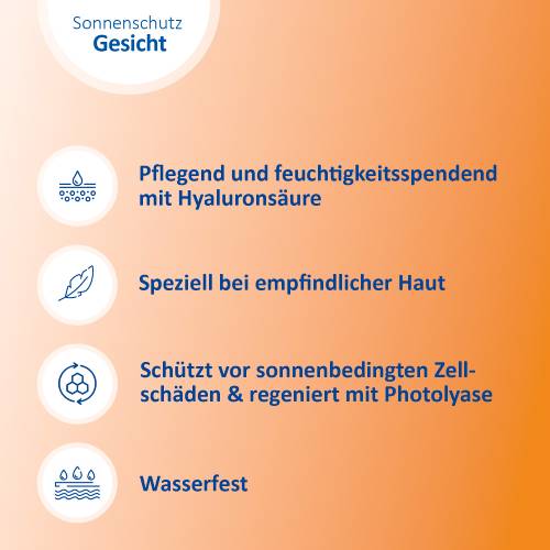 Die reichhaltige Öl-in-Wasser Emulsion pflegt und spendet Feuchtigkeit mit Hyaluronsäure und bietet eine ideale Grundlage für Make-Up. Sie schützt nicht nur effektiv vor sonnenbedingten Zellschäden, sondern unterstützt die Haut auch aktiv bei der Regeneration durch Photolyase. Die leichte Rezeptur legt sich sanft und schützend auf die Haut, ohne Augenreizungen oder Pilling-Effekte (Klumpen des Produktes auf der Haut) oder weiße Rückstände zu hinterlassen – so ist die wasserfeste Lotion der perfekte Begleiter im Alltag.