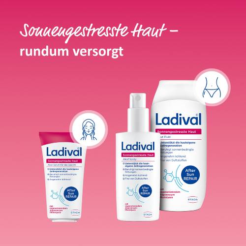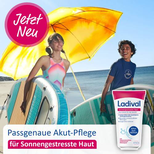 Nach dem Sonnenbaden ist es wichtig, die sonnengestresste Haut optimal zu pflegen und ihre Feuchtigkeitsspeicher aufzufüllen. Sollte Ihre Haut von der Sonne gereizt sein und empfindlich reagieren, verschafft die Ladival® Sonnengestresste Haut Akut-Serie schnell Linderung. Diese wurde speziell für UV-gereizte Haut entwickelt und unterstützt die hauteigene Zellregeneration mit dem Algen-Enzym Photolyase.