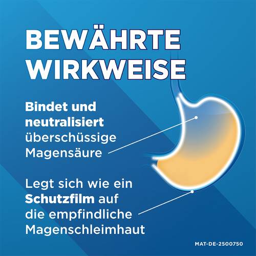 Maaloxan® ist ein sogenanntes Antazidum, das überschüssige Magensäure bindet. Dank der Wirkstoffkombination aus Algeldrat und Magnesiumhydroxid punktet Maaloxan® bei Sodbrennen zweifach – sowohl als Akuthilfe als auch als aktiver Magenschutz. Magnesiumhydroxid lindert den brennenden Schmerz, Algeldrat legt sich wie ein Schutzfilm auf die empfindliche Schleimhaut und unterstützt die Selbstheilung.