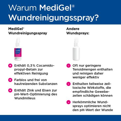 Mit einer Dosierung von 0,3% Betain verfügt MediGel® Wundreinigungsspray über eine hervorragende Reinigungsleistung.