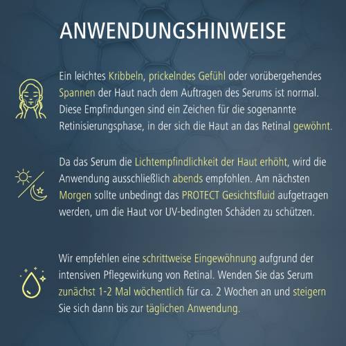 Die Wirksamkeit des Serums wurde im Rahmen einer Studie* bestätigt: Über 90 % der Anwenderinnen berichteten von einer sichtbaren Reduktion der Falten, 81 % beobachteten eine Minderung von Pigmentflecken und über 90 % stellten ein ebenmäßigeres Hautbild fest. Die Anwendung erfolgt abends, zunächst ein- bis zweimal pro Woche. Sobald sich die Haut an das stärker konzentrierte Retinal gewöhnt hat, kann die Anwendung schrittweise bis zu einer täglichen Abendroutine gesteigert werden. Da Retinal die Lichtempfindlichkeit der Haut erhöht, ist ein ergänzender Lichtschutz am Morgen – empfehlungsweise mit dem PROTECT Gesichtsfluid – unverzichtbar, um die Haut vor UV bedingten Schäden zu schützen. Auch bei der Verwendung des 0,1 % Serums kann es in der Anfangszeit zu leichten Hautreaktionen wie Kribbeln, Spannungsgefühlen oder einem leichten Prickeln kommen. Diese sogenannten Retinisierungserscheinungen sind ein Zeichen dafür, dass sich die Haut an den Wirkstoff gewöhnt und erste regenerative Prozesse in Gang gesetzt werden.