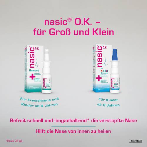Das nasic® O.K. Nasenspray ist für Erwachsene und Kinder ab 6 Jahren geeignet und kann nach dem Öffnen bis zu 6 Monate verwendet werden.