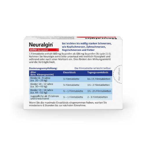 Bei akuten Schmerzen, wie z.B. Kopf-, Zahn- oder Regelschmerz ist schnelle Hilfe gefragt. Neuralgin® extra lindert rasch den Schmerz: Das enthaltene Ibuprofen-Lysin zeigt eine deutlich schnellere Wirkstofffreisetzung als herkömmliches Ibuprofen. Die Schmerztabletten sind bei verschiedensten Arten des Schmerzes effektiv wirksam, auch bei Migräne, Spannungskopfschmerz oder Fieber. Neuralgin® extra ist zudem gut verträglich. Daher ist es bereits für Kinder ab 6 Jahren geeignet.
