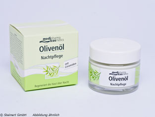 Die Olivenöl Nachtpflege Creme wird zur Pflege der Haut während des Schlafens angewendet. Die Creme enthält eine Kombination aus kaltgepressten Olivenöl und hautpflegenden Ceramiden. Durch diese Kombination wird die Haut während der nächtlichen Aufbauphase gestrafft. Zusätzlich enthaltene Vitamine und Jojobaöl sorgen für eine bessere Spannkraft der Haut und schützen sie zuverlässig vor dem Austrocknen. Durch eine Anwendung der Olivenöl Nachtpflege Creme über Nacht  fühlt sich die Haut morgens zart an und sieht glatter aus.