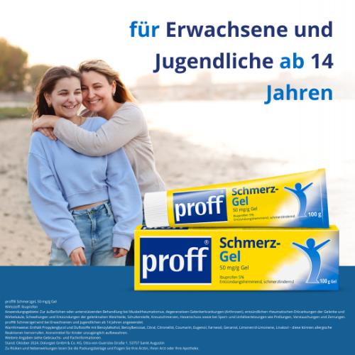 proff® Schmerzgel – Schmerzlinderung mit Ibuprofen Schmerzen in Muskeln und Gelenken können den Alltag stark beeinträchtigen. proff® Schmerzgel wird äußerlich angewendet und gibt den Wirkstoff Ibuprofen über die Haut an die betroffene Stelle ab. Das Gel ist seit 1984 in Deutschland zugelassen und wird seit vielen Jahren in der Schmerzbehandlung eingesetzt. Es ist rezeptfrei, aber apothekenpflichtig erhältlich.