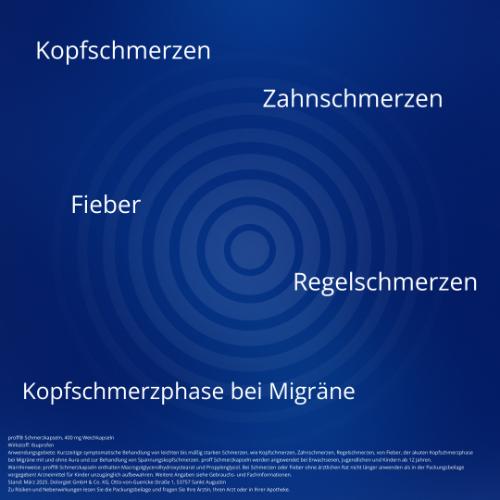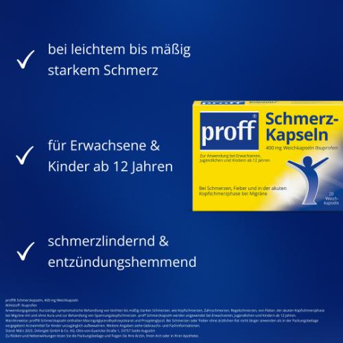 proff® Schmerzkapseln – 400 mg Ibuprofen in einer praktischen Weichkapsel proff® Schmerzkapseln enthalten 400 mg Ibuprofen in einer leicht zu schluckenden Weichkapsel. Sie sind geeignet zur kurzzeitigen Behandlung von Schmerzen und Fieber – auch bei Migräne oder Regelschmerzen.