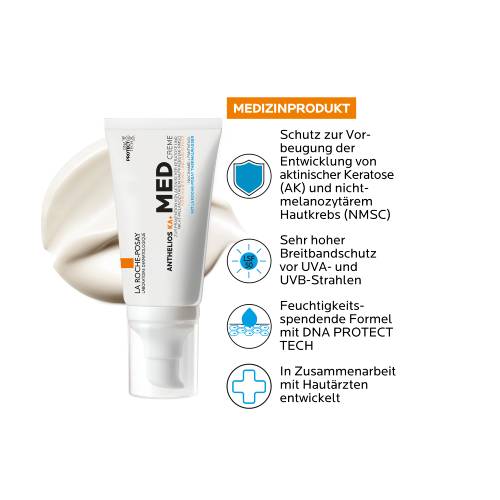 Die hochwirksame Sonnencreme ANTHELIOS KA+ MED Creme zur Prävention aktinischer Keratose (AK) und nicht-melanozytärem Hautkrebs (NMSC) schützt die Haut dank MEXORYL SX und MEXORYL XL vor UVA- und UVB-Strahlen. So hilft die Sonnenpflege bei der Vorbeugung von sonnenbedingten DNA-Schäden. Die hochwirksame Sonnencreme ANTHELIOS KA+ MED enthält keine Duftstoffe. Die feuchtigkeitsspendende Formel mit Niacinamid und Panthenol schützt die Hautbarriere. Anthelios KA+ MED dient der Vorbeugung aktinischer Keratosen (AK) und nicht-melanozytärem Hautkrebs (NMSC).