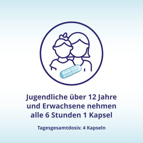 | Jugendliche ab 12 Jahren und Erwachsene | 1 Kapsel | 1-4 mal täglich | im Abstand von 6 Stunden, unabhängig von der Mahlzeit |
