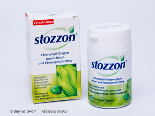 Stozzon Chlorophyll- Dragees gegen Mund- und Körpergeruch. Für Erwachsene und Jugendliche ab 12 Jahren. Wirkstoff: Chlorophyllin-Kupfer-Komplex, Natriumsalz. Anwendungsgebiete: Traditionell angewendet zur Vorbeugung gegen Mund- und Körpergeruch. Beim Auftreten von Krankheitszeichen sollte ein Arzt aufgesucht werden. Warnhinweise: Enthält Saccharose und Lactose.