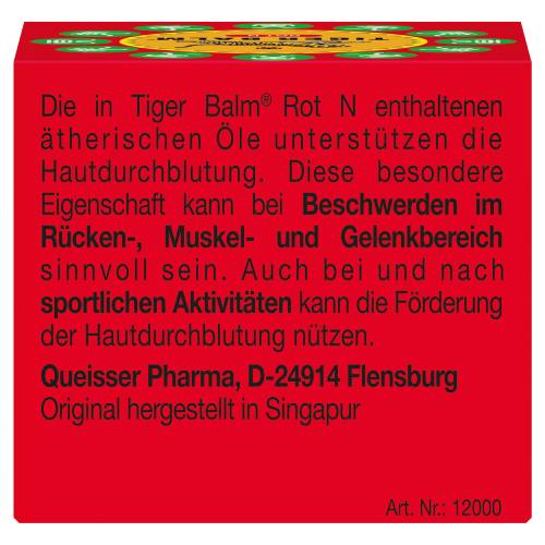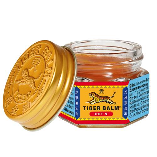Tiger Balm Rot N, Salbe. Für Erwachsene und Jugendliche ab 12 Jahren. Wirkstoffe: Campher racemisch, Levomenthol, Cajeputöl, Pfefferminzöl. Anwendungsgebiet: Zur Förderung der Hautdurchblutung. Warnhinweise: Enthält Campher racemisch, Levomenthol, Cajeput- und Pfefferminzöl.