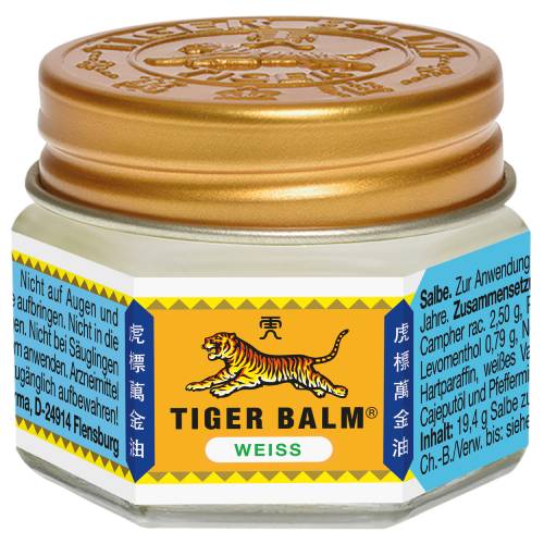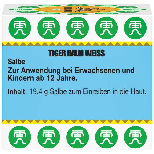 Tiger Balm Weiss, Salbe. Für Erwachsene und Jugendliche ab 12 Jahren. Wirkstoffe: Campher racemisch, Levomenthol, Nelkenöl, Cajeputöl, Pfefferminzöl. Anwendungsgebiete: Zur äußeren Anwendung zur Verbesserung des Befindens bei Erkältungsbeschwerden wie unkomplizierter Schnupfen und Bronchialbeschwerden. Zur Förderung der Hautdurchblutung bei Muskel- und Gelenkbeschwerden wie Verstauchungen, Prellungen, Zerrungen. Warnhinweise: Enthält Campher racemisch, Levomenthol, Cajeput- und Pfefferminzöl.